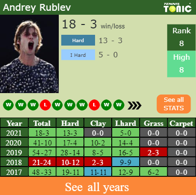 The Russian has a 18-3 win-loss record in 2021, 13-3 on hard (See FULL STATS).