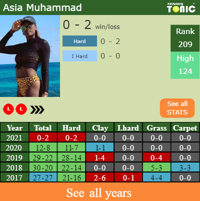 This will be the 6th time that Asia Muhammad and Jamie Loeb fight against each other. The head to head is 4-1 for Loeb (see full H2H stats), but Muhammad leads 1-0 on clay.