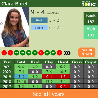 Burel has a 9-4 win-loss record in 2021, 0-0 on clay (See FULL STATS).