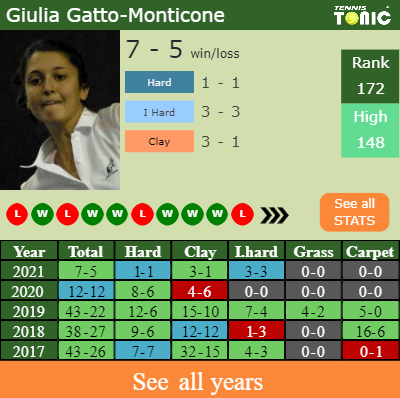 In terms of her career, Giulia has an overall 401-274 record. She has a positive 235-164 record on clay.