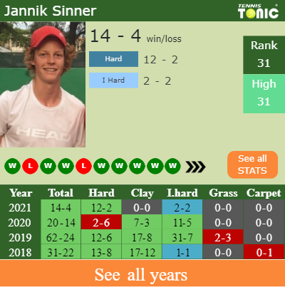 Sinner has a 14-4 win-loss record in 2021, 12-2 on hard (See FULL STATS).