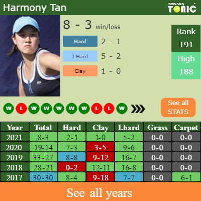Harmony has a 8-3 win-loss record in 2021, 1-0 on clay (See FULL STATS).
