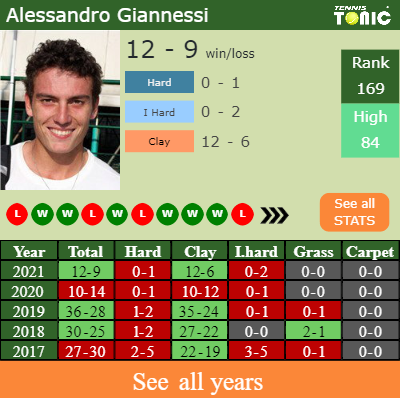 In terms of his career, Giannessi has an overall 372-309 record. He has a positive 319-240 record on clay.