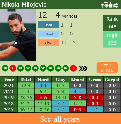 This will be the 2nd time that Nikola Milojevic and Alessandro Giannessi clash against each other. The head to head is 1-0 for Giannessi (see full H2H stats), 1-0 on clay.