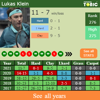 Klein has a 11-7 win-loss record in 2021, 9-5 on clay (See FULL STATS).