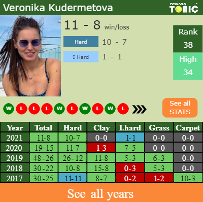 Veronika has a 11-8 win-loss record in 2021, 0-0 on clay (See FULL STATS).