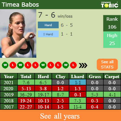 Timea has a 7-6 win-loss record in 2021, 0-0 on clay (See FULL STATS).