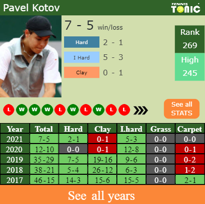 The Russian has a 7-5 win-loss record in 2021, 0-1 on clay (See FULL STATS).