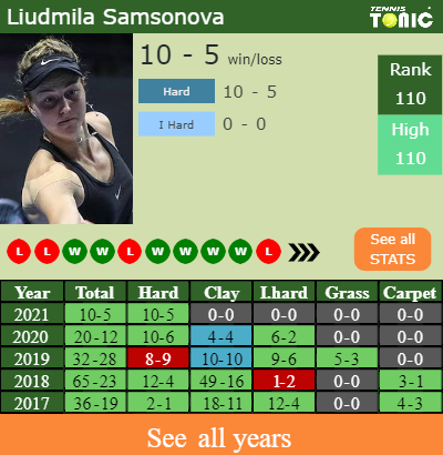 Samsonova has a 10-5 win-loss record in 2021, 0-0 on clay (See FULL STATS).