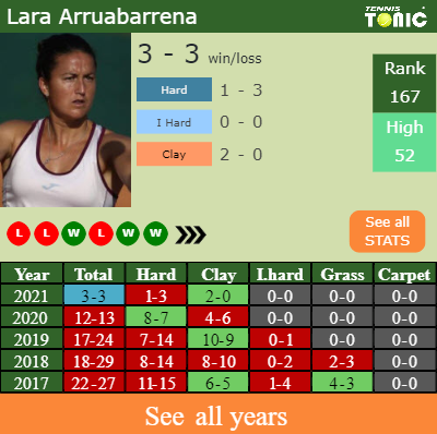 Arruabarrena-Vecino has a positive match record in the last 10 years having won 51% of her matches (215-209). 2-0 on clay in 2021. Regarding her performance on the same surface of this tournament, Arruabarrena-Vecino has a 106-76 record in the last years on clay.
