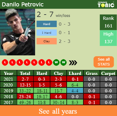 Petrovic has a solid win-loss record in the last 9 years having won 61% of his matches (293-189). 2-3 on clay in 2021. Regarding his performance on the same surface of this event, Petrovic has a 182-92 win-loss record in the last 9 years on clay.