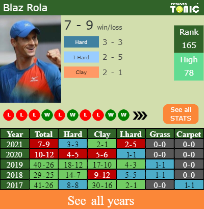 Blaz has a 7-9 win-loss record in 2021, 2-1 on clay (See FULL STATS).