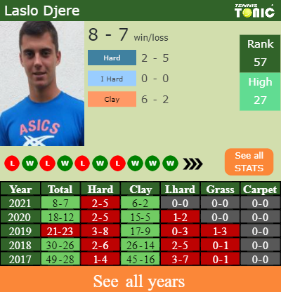 Djere has a 8-7 win-loss record in 2021, 6-2 on clay (See FULL STATS).