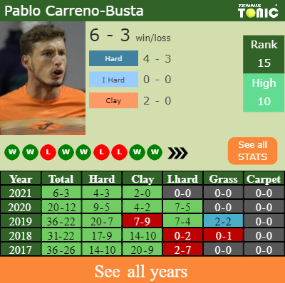 Carreno-Busta has a 6-3 win-loss record in 2021, 2-0 on clay (See FULL STATS).