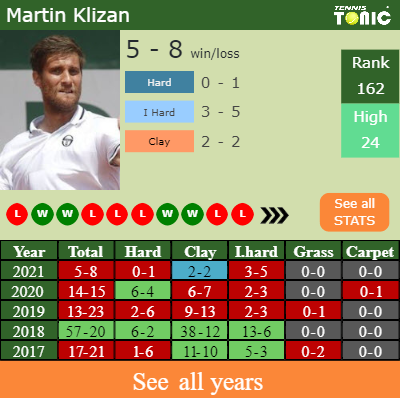 The Slovakian has a 5-8 win-loss record in 2021, 2-2 on clay (See FULL STATS).