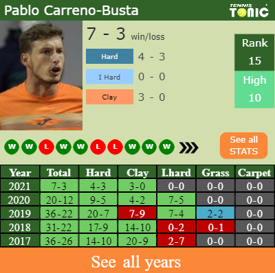 Pablo has a 7-3 win-loss record in 2021, 3-0 on clay (See FULL STATS).