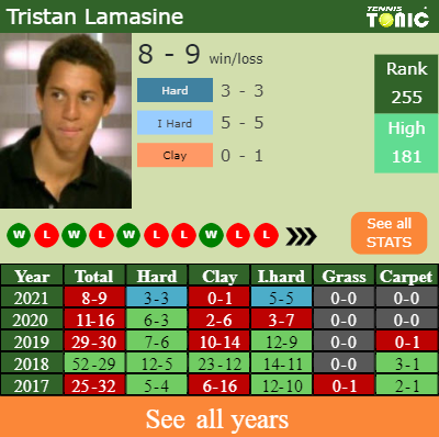 Lamasine has a 8-9 win-loss record in 2021, 0-1 on clay (See FULL STATS).