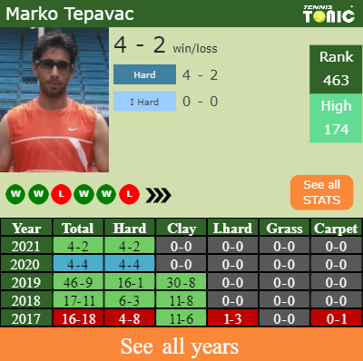 Marko has a 4-2 win-loss record in 2021, 0-0 on clay (See FULL STATS).