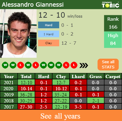 In terms of his career, Giannessi has an overall 372-310 record. He has a positive 319-241 record on clay.
