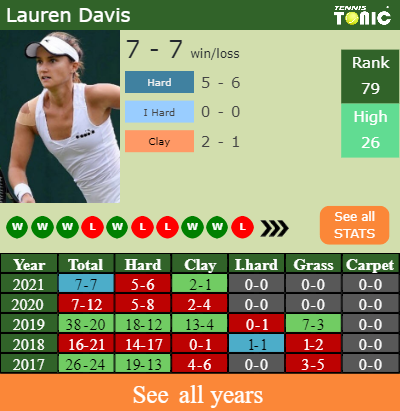 Davis has a 7-7 win-loss record in 2021, 2-1 on clay (See FULL STATS).