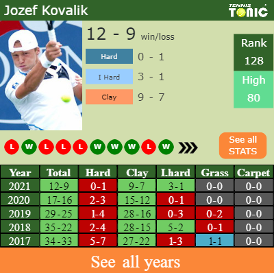 Kovalik has a good win-loss record in the last 10 years having won 59% of his matches (344-237). 9-7 on clay in 2021. In connection with his performance on the same surface of this competition, Kovalik has a 261-153 match record in the last years on clay.