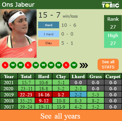 Ons has a 15-7 win-loss record in 2021, 5-1 on clay (See FULL STATS).