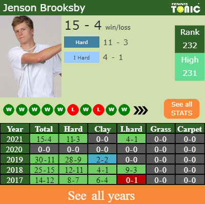 Brooksby has a solid match record in the last 5 years having won 65% of his matches (88-48). 11-3 on hard in 2021. Regarding his performance on the same surface of this competition, Brooksby has a 63-35 record in the last 5 years on hard.