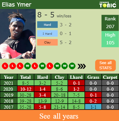 Elias has a 8-5 win-loss record in 2021, 5-2 on clay (See FULL STATS).