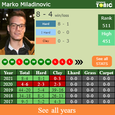 Marko has a 8-4 win-loss record in 2021, 0-3 on clay (See FULL STATS).