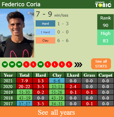 This will be the 3rd time that Federico Coria and Nikola Milojevic face off. The head to head is 2-0 for Milojevic (see full H2H stats), 2-0 on clay.