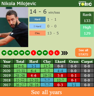 Nikola has a 14-6 win-loss record in 2021, 13-5 on clay (See FULL STATS).