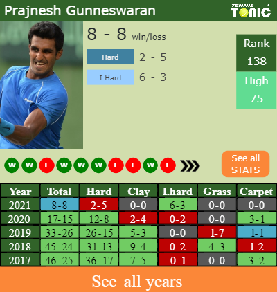 Gunneswaran has a 8-8 win-loss record in 2021, 0-0 on clay (See FULL STATS).