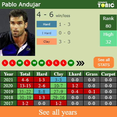 Andujar has a 4-6 win-loss record in 2021, 3-3 on clay (See FULL STATS).