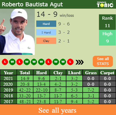 Bautista-Agut has a 14-9 win-loss record in 2021, 2-1 on clay (See FULL STATS).