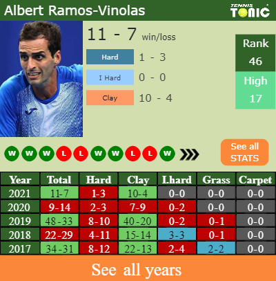 The Spaniard has a 11-7 win-loss record in 2021, 10-4 on clay (See FULL STATS).