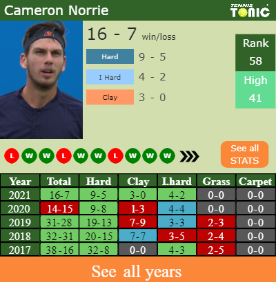 Norrie has a 16-7 win-loss record in 2021, 3-0 on clay (See FULL STATS).