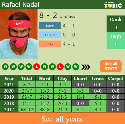 Nadal has a 8-2 win-loss record in 2021, 4-1 on clay (See FULL STATS).