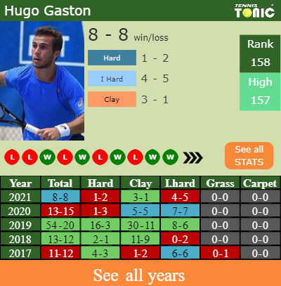 Hugo has a 8-8 win-loss record in 2021, 3-1 on clay (See FULL STATS).