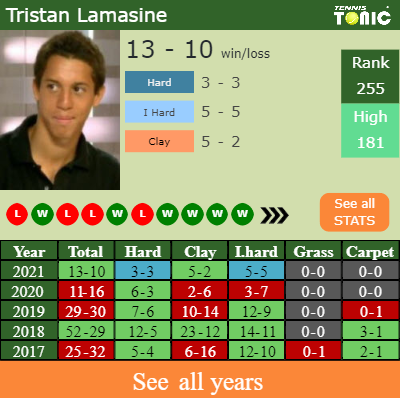 Lamasine started his run at this tournament from the qualifications. In the main draw, he has conceded 2 set in the tournament to win 54% of the points he played.