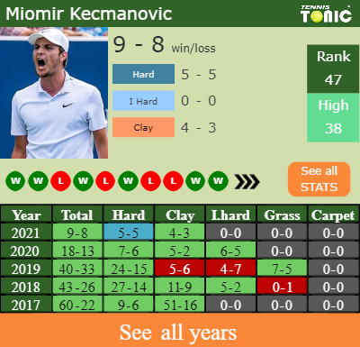 Miomir has a 9-8 win-loss record in 2021, 4-3 on clay (See FULL STATS).