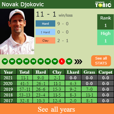 Novak has a 11-1 win-loss record in 2021, 2-1 on clay (See FULL STATS).