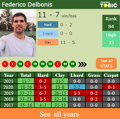 Delbonis has a 11-7 win-loss record in 2021, 11-5 on clay (See FULL STATS).
