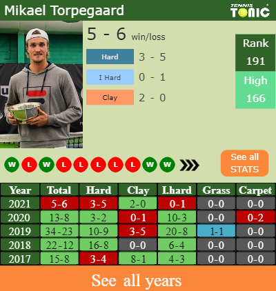 Torpegaard has a 5-6 win-loss record in 2021, 2-0 on clay (See FULL STATS).