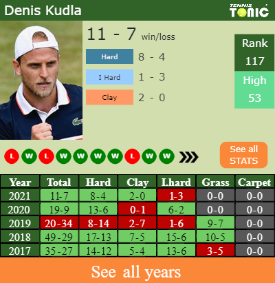 Kudla has a positive record in the last 10 years having won 57% of his matches (333-247). 2-0 on clay in 2021. Regarding his performance on the same surface of this event, Kudla has a 42-41 win-loss record in the last years on clay.
