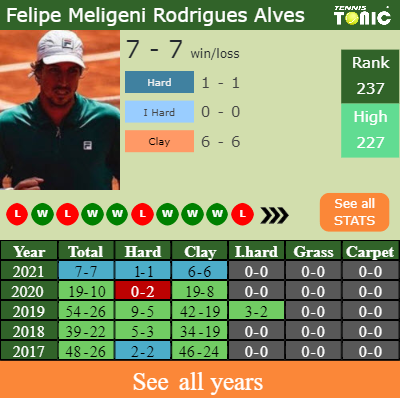 Meligeni Rodrigues Alves has a 7-7 win-loss record in 2021, 6-6 on clay (See FULL STATS).