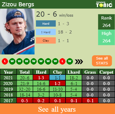 Bergs has a solid win-loss record in the last 6 years having won 62% of his matches (92-56). 1-1 on clay in 2021. Talking about his performance on the same surface of this tournament, Bergs has a 23-22 match record in the last 6 years on clay.