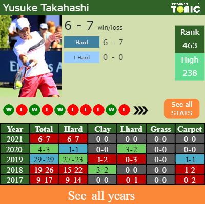 The Japanese has a 6-7 win-loss record in 2021, 6-7 on hard (See FULL STATS).