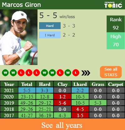 Giron has a 5-5 win-loss record in 2021, 0-0 on clay (See FULL STATS).