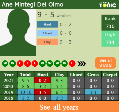 Mintegi Del Olmo has a 9-5 win-loss record in 2021, 9-3 on clay (See FULL STATS).
