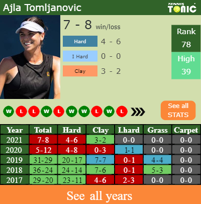 Tomljanovic has a 7-8 win-loss record in 2021, 3-2 on clay (See FULL STATS).